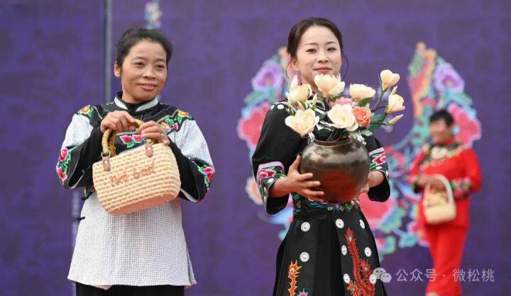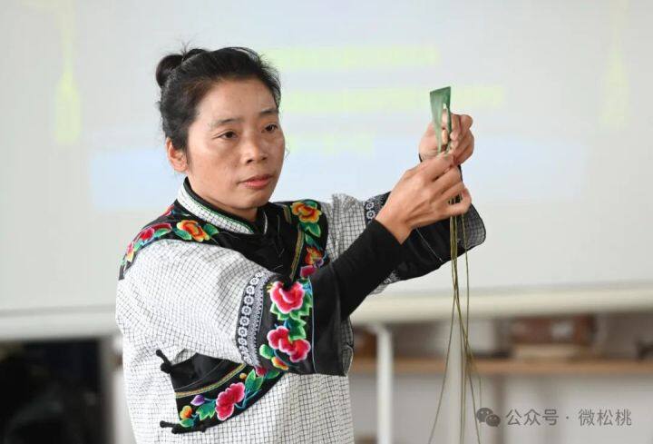 在开班典礼上,身着苗服的模特和参加培训的学员手持手工编织产品进行走秀,多款用玉米皮、灯芯草为原材料制作而成草帽、花瓶等,展现了传统手工艺之美。随后,传统手艺人黄松琴给学员们讲解用玉米皮、灯芯草等材料编织手工产品的技艺。