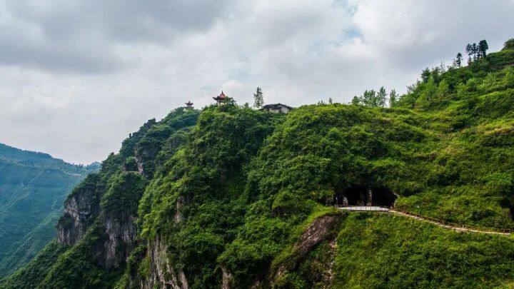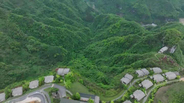 俯瞰朱砂古镇,漫山绿意尽收眼底。经过生态修复,昔日裸露的矿山已被成片的植被覆盖。