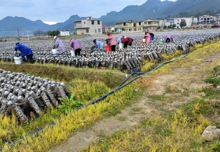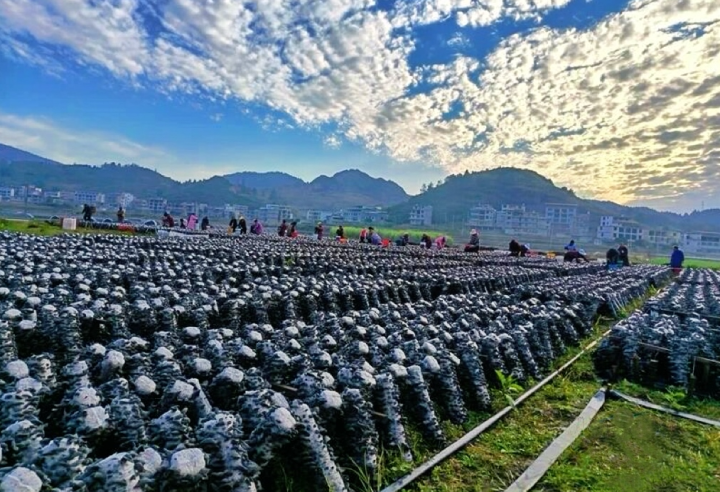 冬日暖阳下,松桃苗族自治县普觉镇木耳种植基地里菌棒整齐排列,一朵朵肥厚的木耳从菌孔中探出头来,在阳光下乌黑透亮、长势喜人。工人们穿梭于菌垄间,熟练地采摘、装桶、搬运,脸上洋溢着收获的喜悦。微风拂过,空气中弥漫着木耳特有的清香,田间地头处处是忙碌而有序的丰收景象。