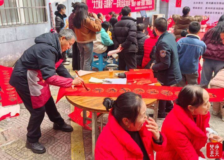活动现场,书法志愿者铺纸研墨、挥毫泼墨,笔锋流转间,一副副春联对仗工整、寓意吉祥,一个个饱满大气、饱含期许的“福”字跃然纸上。乡村院落里,村民们围聚一旁争相甄选,脸上洋溢着幸福笑容;社区楼栋中,志愿者登门走访孤寡老人、困难家庭,送春联、话家常,把新春问候与贴心关怀送到群众心坎上;机关单位与企业厂区内,笔墨致敬坚守岗位的奋斗者,既营造了温馨祥和的节日氛围,更凝聚起干事创业的奋进力量。