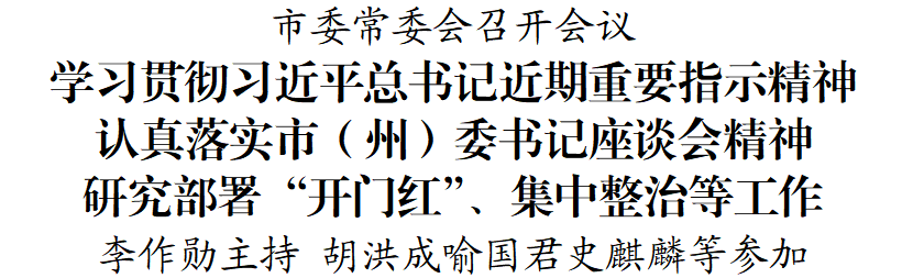 3月1日,市委常委会召开会议,学习贯彻2月27日中央政治局会议精神,学习贯彻习近平总书记近期重要指示精神,贯彻落实中央有关会议和文件精神,认真落实省委常委会扩大会议、市(州)委书记座谈会等会议精神,研究部署“开门红”、农业农村、科技创新、集中整治等工作。