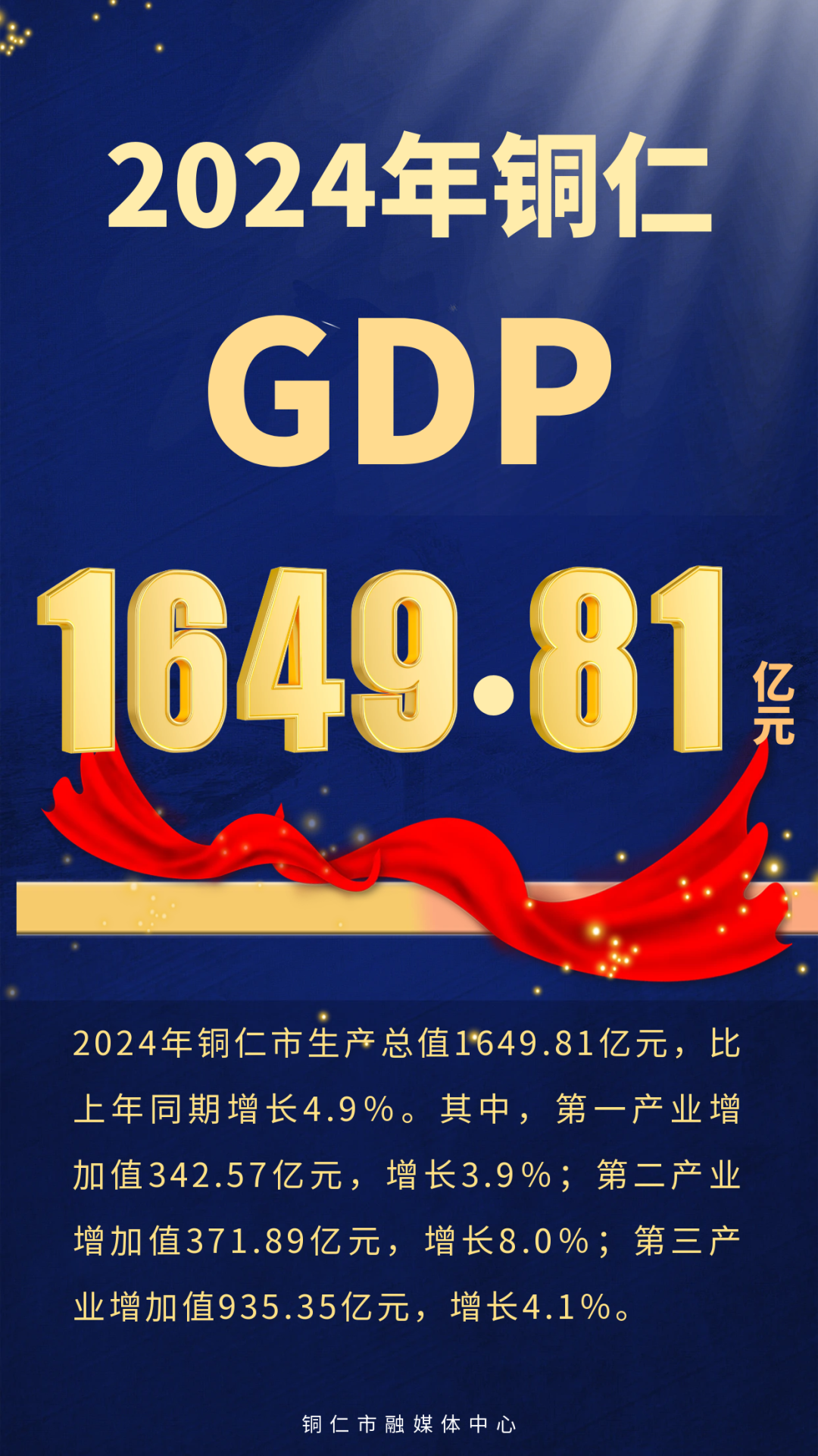 根据市(州)生产总值统一核算结果,2024年铜仁市生产总值1649.81亿元,比上年同期增长4.9%。其中,第一产业增加值342.57亿元,增长3.9%;第二产业增加值371.89亿元,增长8.0%;第三产业增加值935.35亿元,增长4.1%。