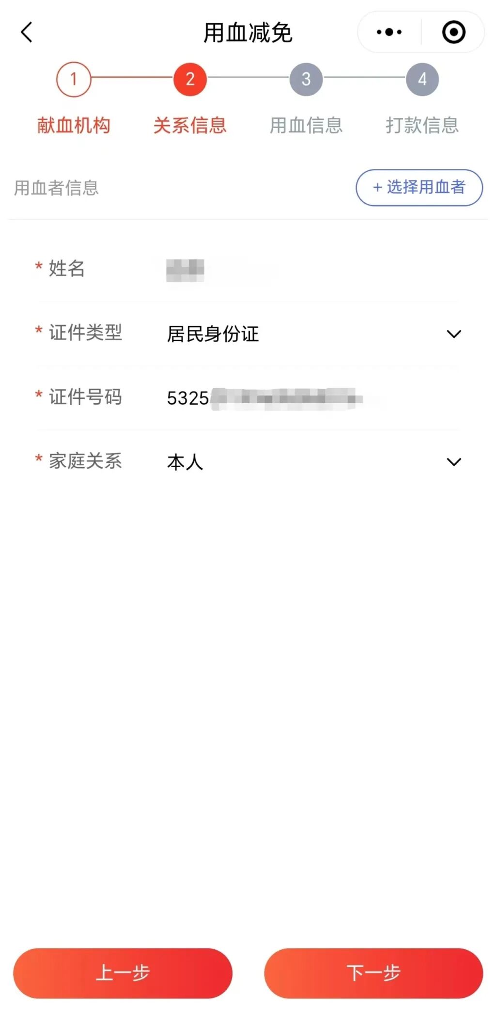 右上角点击选择用血者按钮,如果已有可直接选择关系信息,如果没有则先新增(具体操作见下文,页面见小程序截图6)。