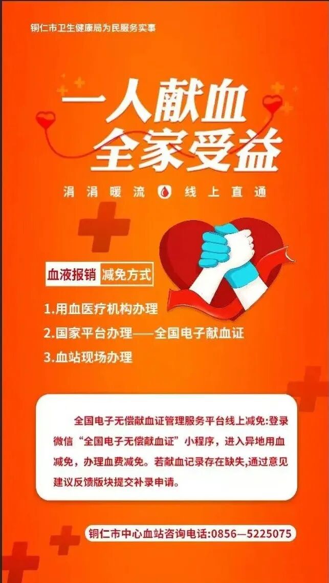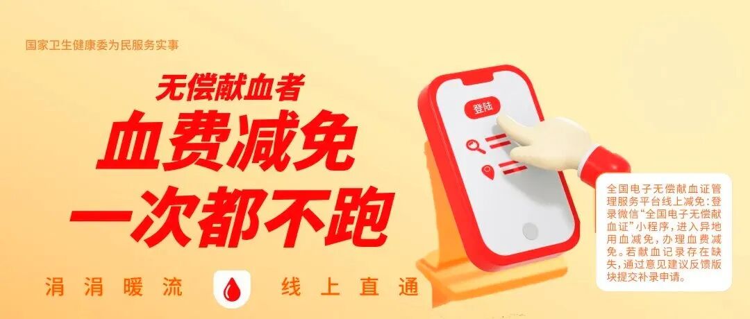 即日起,无偿献血者可以通过国家政务服务平台、中国政府网、国家卫生健康委官网,微信、支付宝、百度“全国电子无偿献血证”小程序等查询献血记录;可通过微信“全国电子无偿献血证”小程序在线办理无偿献血者血费跨省异地减免申请。为保障您的相关权益,建议您及时查询并完善相关献血信息,以便我们为您提供更加优质的无偿献血服务。感谢您对我国无偿献血事业的支持!