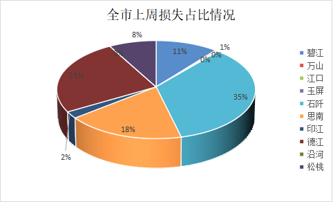 上周损失最多的三个区县分别是:石阡(占比34.81%)、德江(占比25.16%)、思南(占比18.33%)。