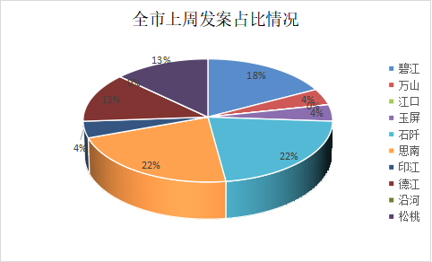 上周发案前三的区县分别是:石阡、思南(占比21.74%),碧江(占比17.39%)。