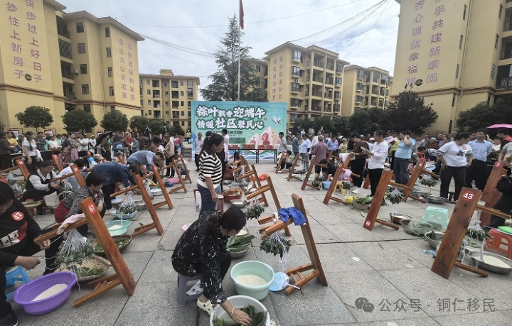 在铜仁市易地扶贫搬迁安置点,传统节日是文化活动的高潮时刻。端午节时,社区组织包粽子比赛,搬迁群众围坐一桌,卷粽叶、放馅料、绑绳子,动作娴熟又充满欢乐,现场粽叶飘香,笑语不断。