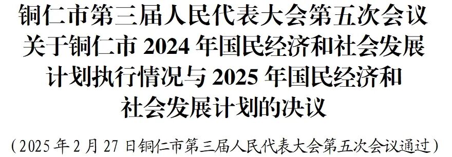 铜仁市第三届人民代表大会第五次会议审查了市人民政府提出的《铜仁市2024年国民经济和社会发展计划执行情况与2025年国民经济和社会发展计划草案的报告》及铜仁市2025年国民经济和社会发展计划草案,同意铜仁市第三届人民代表大会第五次会议财经审查委员会的审查结果报告。会议决定,批准《铜仁市2024年国民经济和社会发展计划执行情况与2025年国民经济和社会发展计划草案的报告》,批准铜仁市2025年国民经济和社会发展计划。